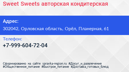 Sweet Sweets, авторская кондитерская по адресу 302042, Орловская область, Орёл, Планерная, 61 в дальнейшем Организация, размещена в следующих категориях: