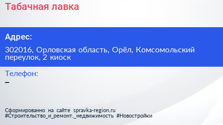 Табачная лавка по адресу 302016, Орловская область, Орёл, Комсомольский переулок, 2 киоск в дальнейшем Организация, размещена в следующих категориях: