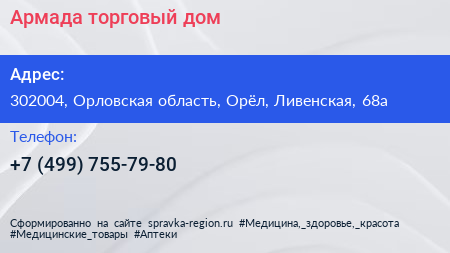 Армада, торговый дом по адресу 302004, Орловская область, Орёл, Ливенская, 68а в дальнейшем Организация, размещена в следующих категориях: