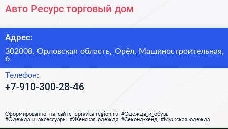 Авто Ресурс, торговый дом по адресу 302008, Орловская область, Орёл, Машиностроительная, 6 в дальнейшем Организация, размещена в следующих категориях: