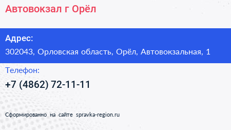 Автовокзал, г. Орёл по адресу 302043, Орловская область, Орёл, Автовокзальная, 1 в дальнейшем Организация, размещена в следующих категориях: