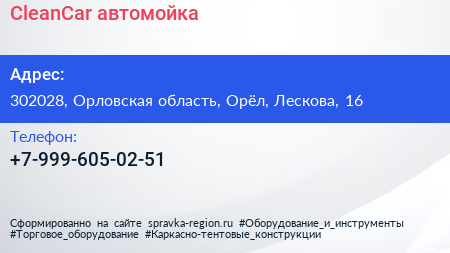 CleanCar, автомойка по адресу 302028, Орловская область, Орёл, Лескова, 16 в дальнейшем Организация, размещена в следующих категориях: