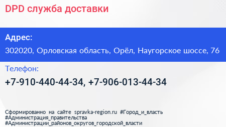 DPD, служба доставки по адресу 302020, Орловская область, Орёл, Наугорское шоссе, 76 в дальнейшем Организация, размещена в следующих категориях: