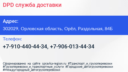 DPD, служба доставки по адресу 302029, Орловская область, Орёл, Раздольная, 84Б в дальнейшем Организация, размещена в следующих категориях: