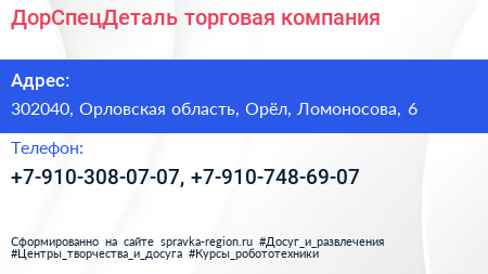 ДорСпецДеталь, торговая компания по адресу 302040, Орловская область, Орёл, Ломоносова, 6 в дальнейшем Организация, размещена в следующих категориях: