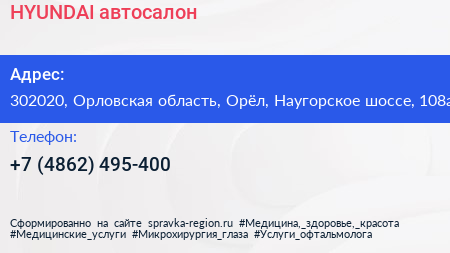 HYUNDAI, автосалон по адресу 302020, Орловская область, Орёл, Наугорское шоссе, 108а в дальнейшем Организация, размещена в следующих категориях: