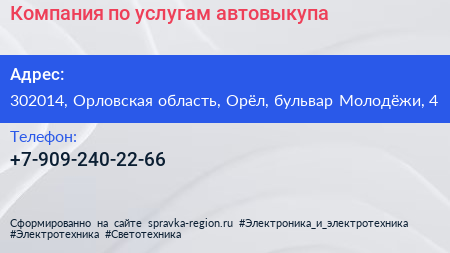 Компания по услугам автовыкупа по адресу 302014, Орловская область, Орёл, бульвар Молодёжи, 4 в дальнейшем Организация, размещена в следующих категориях: