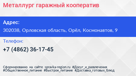 Металлург, гаражный кооператив по адресу 302038, Орловская область, Орёл, Космонавтов, 9 в дальнейшем Организация, размещена в следующих категориях: