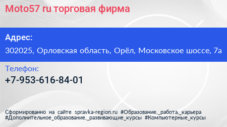 Moto57.ru, торговая фирма по адресу 302025, Орловская область, Орёл, Московское шоссе, 7а в дальнейшем Организация, размещена в следующих категориях: