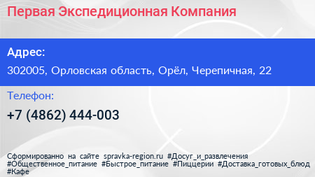 Первая Экспедиционная Компания по адресу 302005, Орловская область, Орёл, Черепичная, 22 в дальнейшем Организация, размещена в следующих категориях: