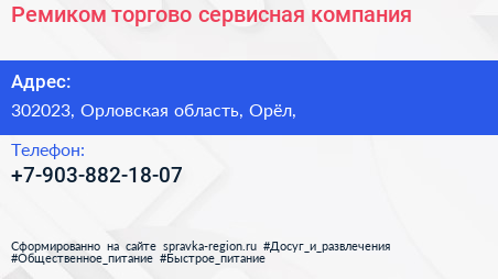 Ремиком, торгово-сервисная компания по адресу 302023, Орловская область, Орёл, в дальнейшем Организация, размещена в следующих категориях: