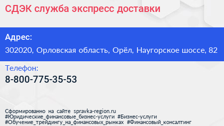 СДЭК, служба экспресс-доставки по адресу 302020, Орловская область, Орёл, Наугорское шоссе, 82 в дальнейшем Организация, размещена в следующих категориях: