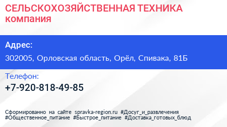 СЕЛЬСКОХОЗЯЙСТВЕННАЯ ТЕХНИКА, компания по адресу 302005, Орловская область, Орёл, Спивака, 81Б в дальнейшем Организация, размещена в следующих категориях: