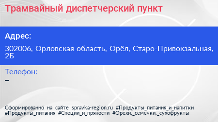 Трамвайный диспетчерский пункт по адресу 302006, Орловская область, Орёл, Старо-Привокзальная, 2Б в дальнейшем Организация, размещена в следующих категориях: