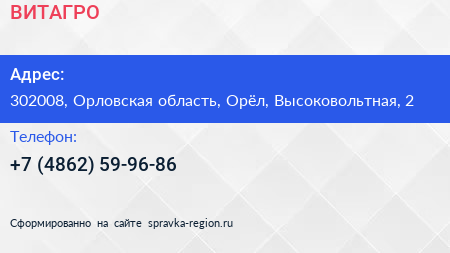 ВИТАГРО по адресу 302008, Орловская область, Орёл, Высоковольтная, 2 в дальнейшем Организация, размещена в следующих категориях:
