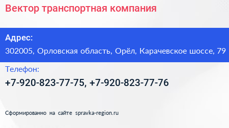 Вектор, транспортная компания по адресу 302005, Орловская область, Орёл, Карачевское шоссе, 79 в дальнейшем Организация, размещена в следующих категориях: