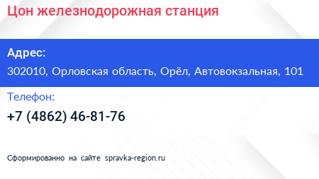 Цон, железнодорожная станция по адресу 302010, Орловская область, Орёл, Автовокзальная, 101 в дальнейшем Организация, размещена в следующих категориях: