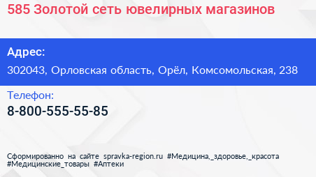 585 Золотой, сеть ювелирных магазинов по адресу 302043, Орловская область, Орёл, Комсомольская, 238 в дальнейшем Организация, размещена в следующих категориях:
