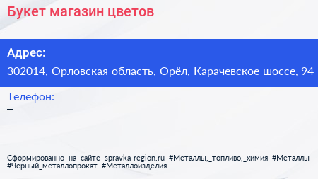 Букет, магазин цветов по адресу 302014, Орловская область, Орёл, Карачевское шоссе, 94 в дальнейшем Организация, размещена в следующих категориях: