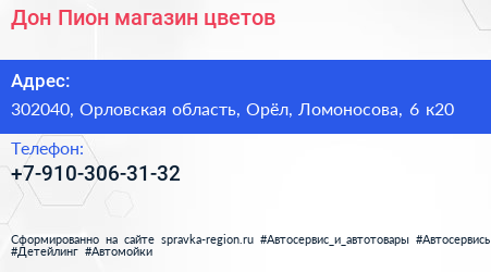 Дон Пион, магазин цветов по адресу 302040, Орловская область, Орёл, Ломоносова, 6 к20 в дальнейшем Организация, размещена в следующих категориях: