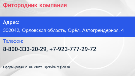 Фитородник, компания по адресу 302042, Орловская область, Орёл, Автогрейдерная, 4 в дальнейшем Организация, размещена в следующих категориях: