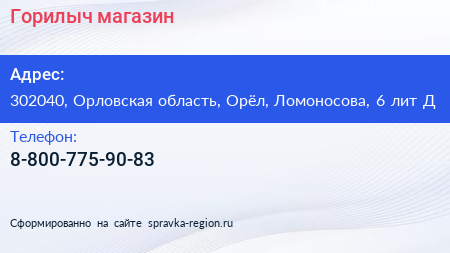 Горилыч, магазин по адресу 302040, Орловская область, Орёл, Ломоносова, 6 лит Д в дальнейшем Организация, размещена в следующих категориях: