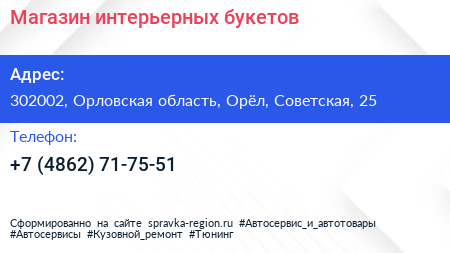Магазин интерьерных букетов по адресу 302002, Орловская область, Орёл, Советская, 25 в дальнейшем Организация, размещена в следующих категориях: