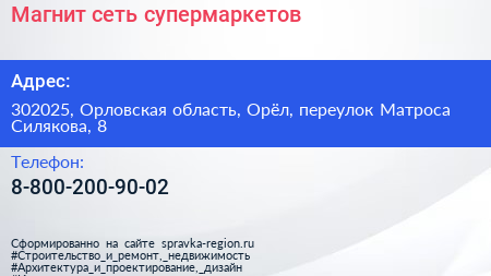 Магнит, сеть супермаркетов по адресу 302025, Орловская область, Орёл, переулок Матроса Силякова, 8 в дальнейшем Организация, размещена в следующих категориях: