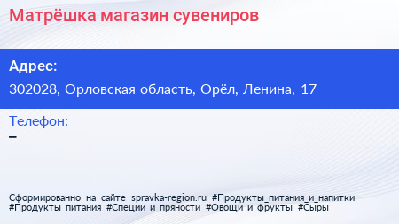 Матрёшка, магазин сувениров по адресу 302028, Орловская область, Орёл, Ленина, 17 в дальнейшем Организация, размещена в следующих категориях: