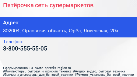 Пятёрочка, сеть супермаркетов по адресу 302004, Орловская область, Орёл, Ливенская, 20а в дальнейшем Организация, размещена в следующих категориях: