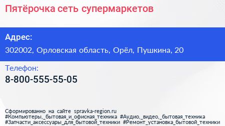 Пятёрочка, сеть супермаркетов по адресу 302002, Орловская область, Орёл, Пушкина, 20 в дальнейшем Организация, размещена в следующих категориях: