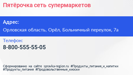 Пятёрочка, сеть супермаркетов по адресу Орловская область, Орёл, Больничный переулок, 7а в дальнейшем Организация, размещена в следующих категориях: