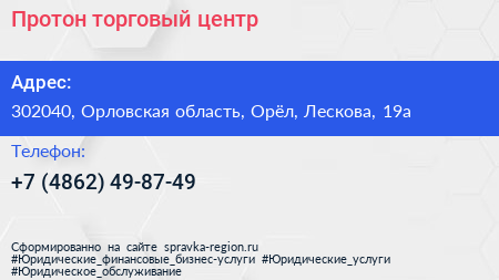 Протон, торговый центр по адресу 302040, Орловская область, Орёл, Лескова, 19а в дальнейшем Организация, размещена в следующих категориях: