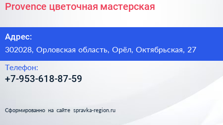 Provence, цветочная мастерская по адресу 302028, Орловская область, Орёл, Октябрьская, 27 в дальнейшем Организация, размещена в следующих категориях: