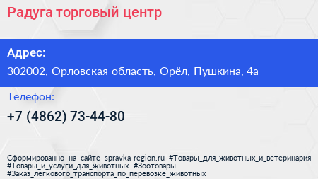 Радуга, торговый центр по адресу 302002, Орловская область, Орёл, Пушкина, 4а в дальнейшем Организация, размещена в следующих категориях: