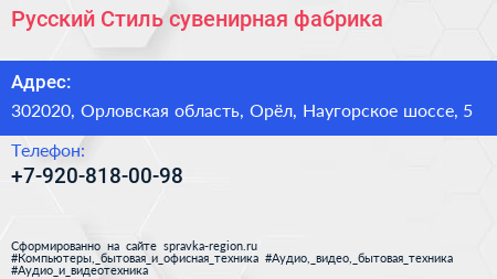 Русский Стиль, сувенирная фабрика по адресу 302020, Орловская область, Орёл, Наугорское шоссе, 5 в дальнейшем Организация, размещена в следующих категориях: