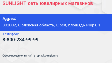 SUNLIGHT, сеть ювелирных магазинов по адресу 302002, Орловская область, Орёл, площадь Мира, 1 в дальнейшем Организация, размещена в следующих категориях: