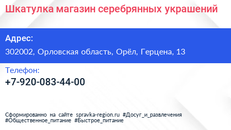 Шкатулка, магазин серебрянных украшений по адресу 302002, Орловская область, Орёл, Герцена, 13 в дальнейшем Организация, размещена в следующих категориях: