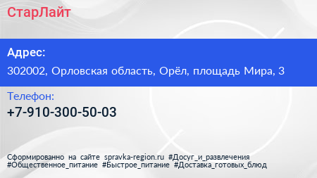 СтарЛайт по адресу 302002, Орловская область, Орёл, площадь Мира, 3 в дальнейшем Организация, размещена в следующих категориях: