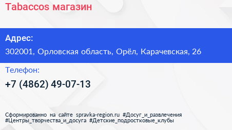 Tabaccos, магазин по адресу 302001, Орловская область, Орёл, Карачевская, 26 в дальнейшем Организация, размещена в следующих категориях: