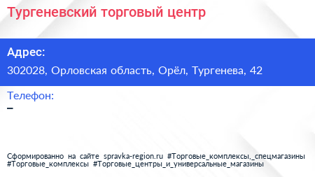 Тургеневский, торговый центр по адресу 302028, Орловская область, Орёл, Тургенева, 42 в дальнейшем Организация, размещена в следующих категориях: