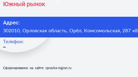 Южный, рынок по адресу 302010, Орловская область, Орёл, Комсомольская, 287 к8 в дальнейшем Организация, размещена в следующих категориях: