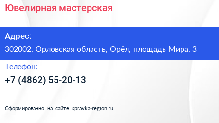 Ювелирная мастерская по адресу 302002, Орловская область, Орёл, площадь Мира, 3 в дальнейшем Организация, размещена в следующих категориях:
