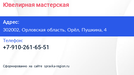 Ювелирная мастерская по адресу 302002, Орловская область, Орёл, Пушкина, 4 в дальнейшем Организация, размещена в следующих категориях: