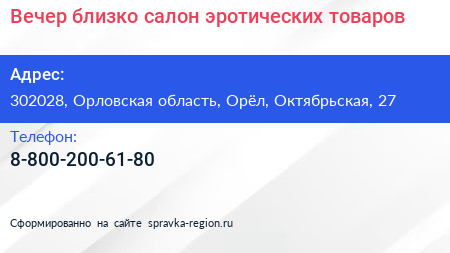 Вечер близко, салон эротических товаров по адресу 302028, Орловская область, Орёл, Октябрьская, 27 в дальнейшем Организация, размещена в следующих категориях:
