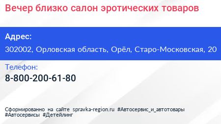 Вечер близко, салон эротических товаров по адресу 302002, Орловская область, Орёл, Старо-Московская, 20 в дальнейшем Организация, размещена в следующих категориях: