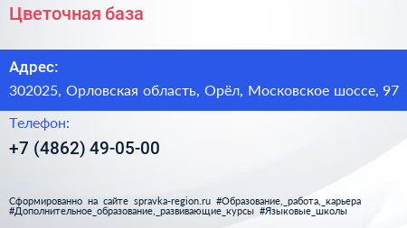 Цветочная база по адресу 302025, Орловская область, Орёл, Московское шоссе, 97 в дальнейшем Организация, размещена в следующих категориях: