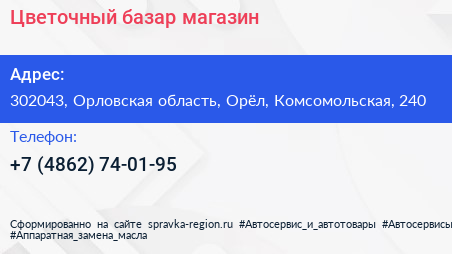 Цветочный базар, магазин по адресу 302043, Орловская область, Орёл, Комсомольская, 240 в дальнейшем Организация, размещена в следующих категориях:
