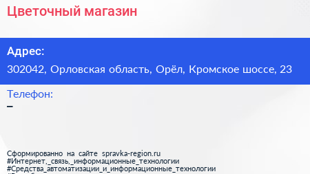 Цветочный магазин по адресу 302042, Орловская область, Орёл, Кромское шоссе, 23 в дальнейшем Организация, размещена в следующих категориях: