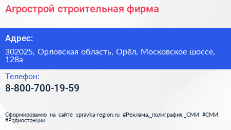 Агрострой, строительная фирма по адресу 302025, Орловская область, Орёл, Московское шоссе, 128а в дальнейшем Организация, размещена в следующих категориях: